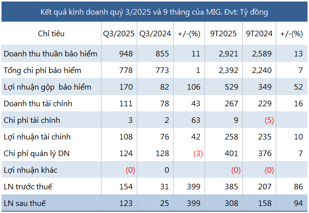 Nhờ tăng trưởng mạnh ở cả 2 mảng kinh doanh bảo hiểm và tài chính, Tổng CTCP Bảo hiểm Quân Đội (MIC, HOSE: MIG) ghi nhận lợi nhuận quý 3/2025 bứt tốc.