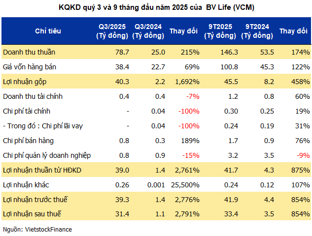 Quý 3/2025, BV Life đạt lãi ròng hơn 31 tỷ đồng, tăng gần 2,800% so với cùng kỳ và lập kỷ lục cao nhất trong lịch sử hoạt động. Kết quả này vượt xa các năm trước, lãi ròng năm 2024 chỉ gần 4 tỷ đồng và năm 2023 gần 1 tỷ đồng. Doanh thu quý 3 đạt gần 79 tỷ đồng, tăng tới 215% so với cùng kỳ và là mức cao nhất trong 15 năm qua. Biên lãi gộp đạt hơn 51%, cùng kỳ chỉ 8.8%.