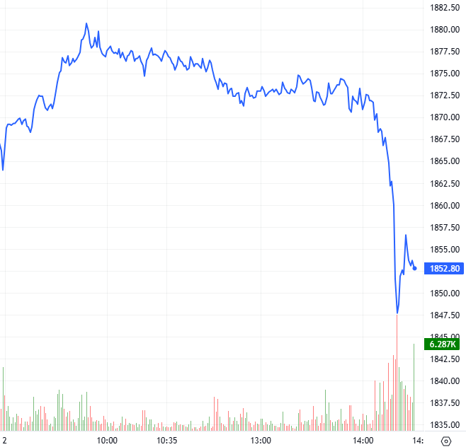 Trong phiên giao dịch ngày 02/10/2025, hợp đồng 41I1FA000 bật tăng từ đầu phiên nhưng bên bán dần quay trở lại khiến FA000 chuyển sang giằng co trong phần lớn thời gian phiên sáng. Sang đến phiên chiều, diễn biến đi ngang tiếp tục diễn ra và áp lực bán bất ngờ gia tăng mạnh khiến hợp đồng này đảo chiều lao dốc sâu và đóng cửa với mức giảm hơn 11 điểm.