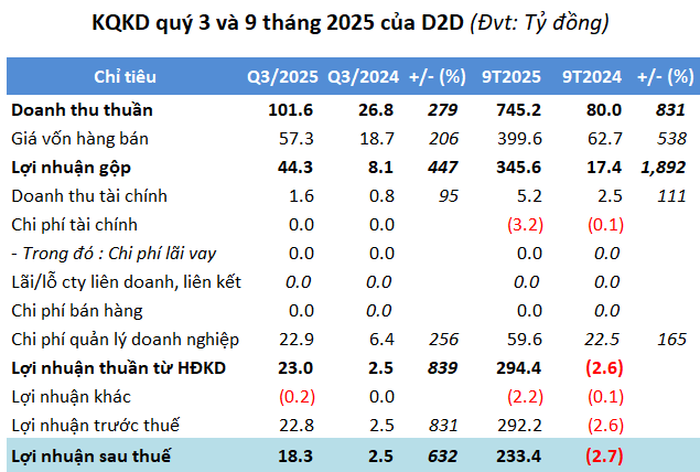 Trong quý 3, D2D thu về gần 102 tỷ đồng doanh thu thuần, gấp 3.8 lần cùng kỳ. Lợi nhuận ròng hơn 18 tỷ đồng, gấp 7.3 lần. Công ty cho biết doanh thu tăng mạnh chủ yếu đến từ chuyển nhượng đất khu công nghiệp (KCN) Châu Đức khiến lợi nhuận tăng.
