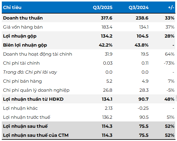 Trong quý 3/2025, doanh nghiệp chuyên về dịch vụ khai thác hàng hóa tại sân bay Nội Bài ghi nhận doanh thu thuần gần 318 tỷ đồng, tăng mạnh 33% so với cùng kỳ năm trước và là mức cao nhất trong lịch sử hoạt động. Lãi ròng cũng lập kỷ lục hơn 114 tỷ đồng, tăng 51%.