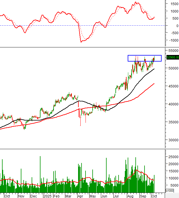 Giá cổ phiếu CTG hồi phục trong phiên giao dịch ngày 08/10/2025 dù đang test lại đỉnh cũ tháng 08/2025 (tương đương vùng 52,000-53,500).