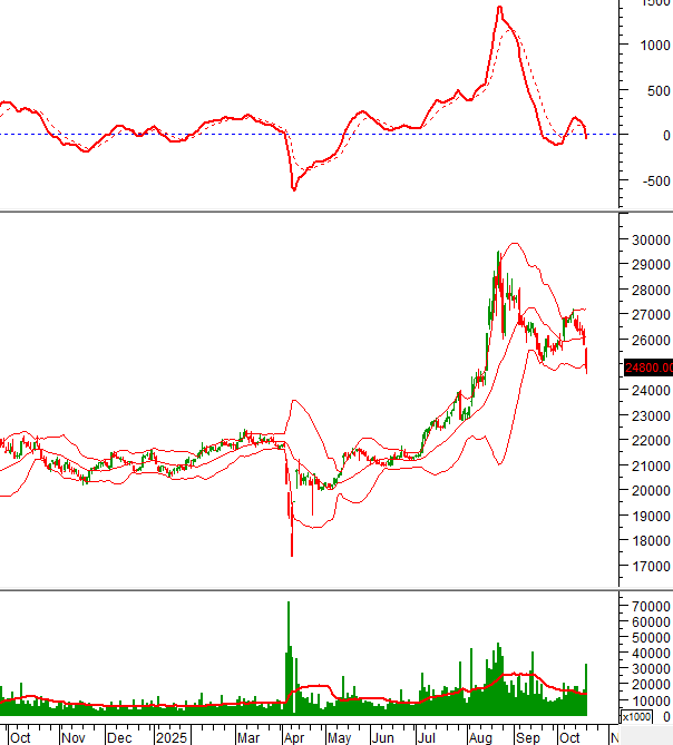 Giá đã phá vỡ đáy cũ tháng 09/2025 (tương đương vùng 25,000-25,500) nên nhà đầu tư cần thận trọng.