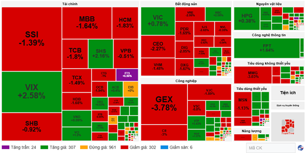 Kết thúc phiên giao dịch, VN-Index giảm 30.64 điểm (-1.82%), xuống mức 1,652.54 điểm; HNX-Index giảm 1.92 điểm (-0.72%), xuống mức 265.36 điểm. Độ rộng toàn thị trường với sắc đỏ có phần áp đảo với bên bán có 536 mã giảm và bên mua có 125 mã tăng. Tương tự, sắc đỏ cũng áp đảo trong rổ VN30 với 24 mã giảm, 5 mã tăng và 1 mã tham chiếu.