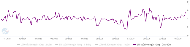 Trên thị trường liên ngân hàng, lãi suất qua đêm ngày 16/10 tăng mạnh lên 5.75%/năm, tương đương tăng 96 điểm cơ bản, là mức cao nhất trong gần 2 tháng. Giá trị giao dịch bình quân cũng tăng 7% so với tuần trước, đạt khoảng 629 nghìn tỷ đồng/ngày.