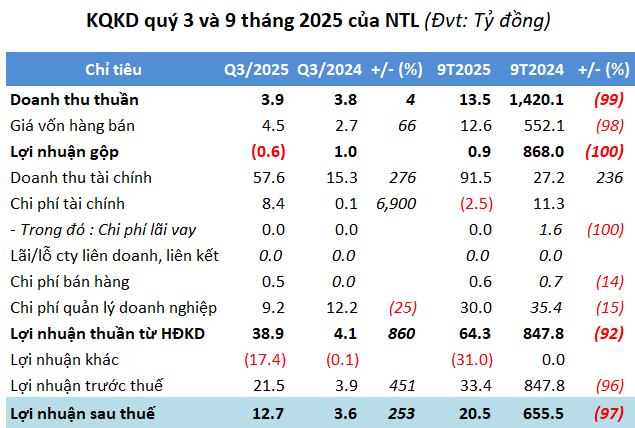 Lũy kế 9 tháng, doanh thu thuần gần 14 tỷ đồng, lãi sau thuế hơn 20 tỷ đồng, giảm sâu 99% và 97%.Cùng kỳ năm trước NTL có kết quả kinh doanh tăng đột biến nhờ ghi nhận thêm doanh thu, lợi nhuận, giá vốn phần diện tích đất đã bán cho khách hàng của dự án khu đô thị Bãi Muối thuộc phường Cao Thắng, Hà Khánh, Hà Lầm, TP. Hạ Long, tỉnh Quảng Ninh.