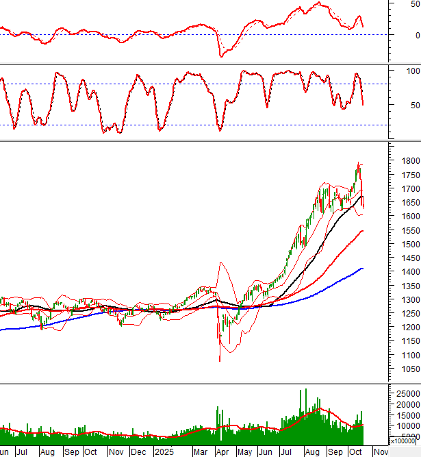 Trong phiên giao dịch sáng ngày 21/10/2025, VN-Index tiếp tục điều chỉnh và test đáy cũ tháng 08/2025 (tương đương 1,605-1,630 điểm).