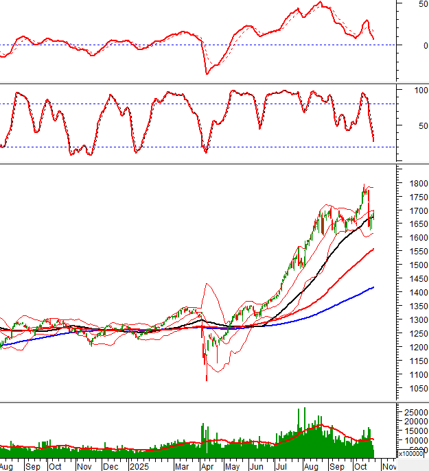 Trong phiên giao dịch sáng ngày 24/10/2025, VN-Index giằng co mạnh và điều chỉnh sau khi tiến sát đường Middle của Bollinger Bands.