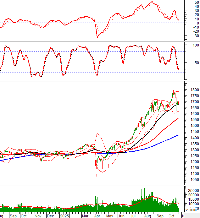 Trong phiên giao dịch sáng ngày 27/10/2025, giá cổ phiếu IDC tăng và đang kiểm tra lại đường Middle của Bollinger Bands cùng khối lượng giao dịch có sự gia tăng trong phiên sáng cho thấy tâm lý nhà đầu tư khá lạc quan.