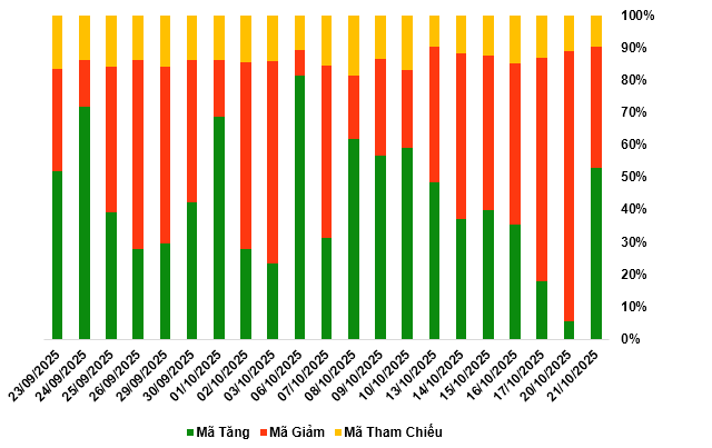 Kết thúc phiên giao dịch ngày 21/10/2025, toàn thị trường có 138 mã tăng, 99 mã giảm và 24 mã tham chiếu.
