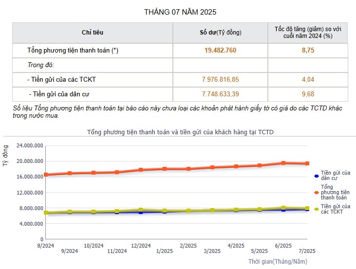 Như vậy, sau 7 tháng đầu năm 2025, tổng tiền của cá nhân và tổ chức kinh tế gửi vào hệ thống ngân hàng đạt hơn 15.7 triệu tỷ đồng.