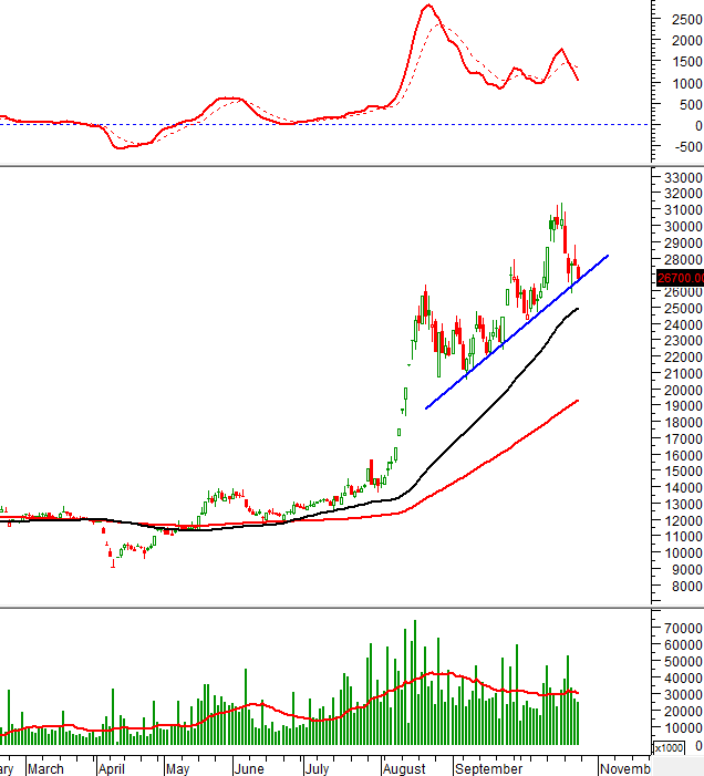 Đường trendline ngắn hạn (tương đương vùng 26,000-27,000) đã hỗ trợ rất tốt cho giá trong đợt điều chỉnh vừa qua.