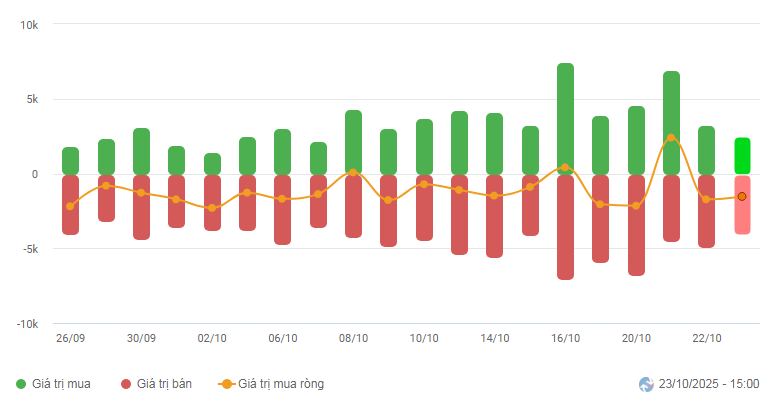 Biến động của dòng tiền từ khối ngoại: Khối ngoại tiếp tục bán ròng trong phiên giao dịch ngày 23/10/2025. Nếu nhà đầu tư nước ngoài duy trì hành động này trong những phiên tới thì tình trạng rung lắc có thể còn tiếp diễn.